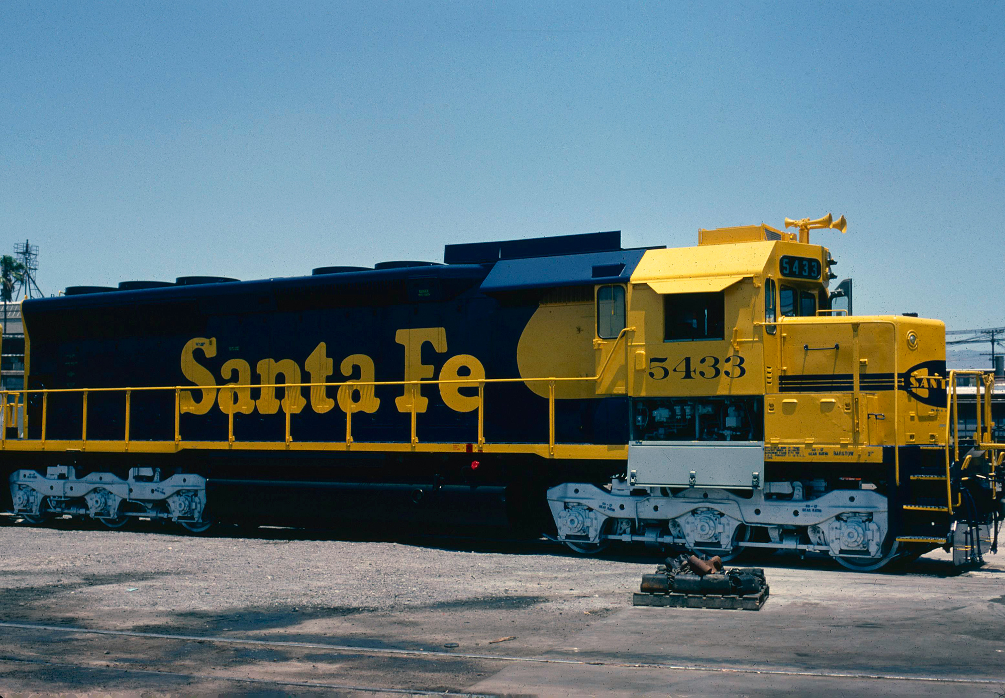 Santa Fe SD45u #5433 following its rebuild at the San Bernardino Shops on June 13, 1981. Steve Wille photo. American-Rails.com collection.From this point officials sought a two-pronged approach; they would continue the original line southwestward and also build due west through Colorado to tap the state's booming mining industry.