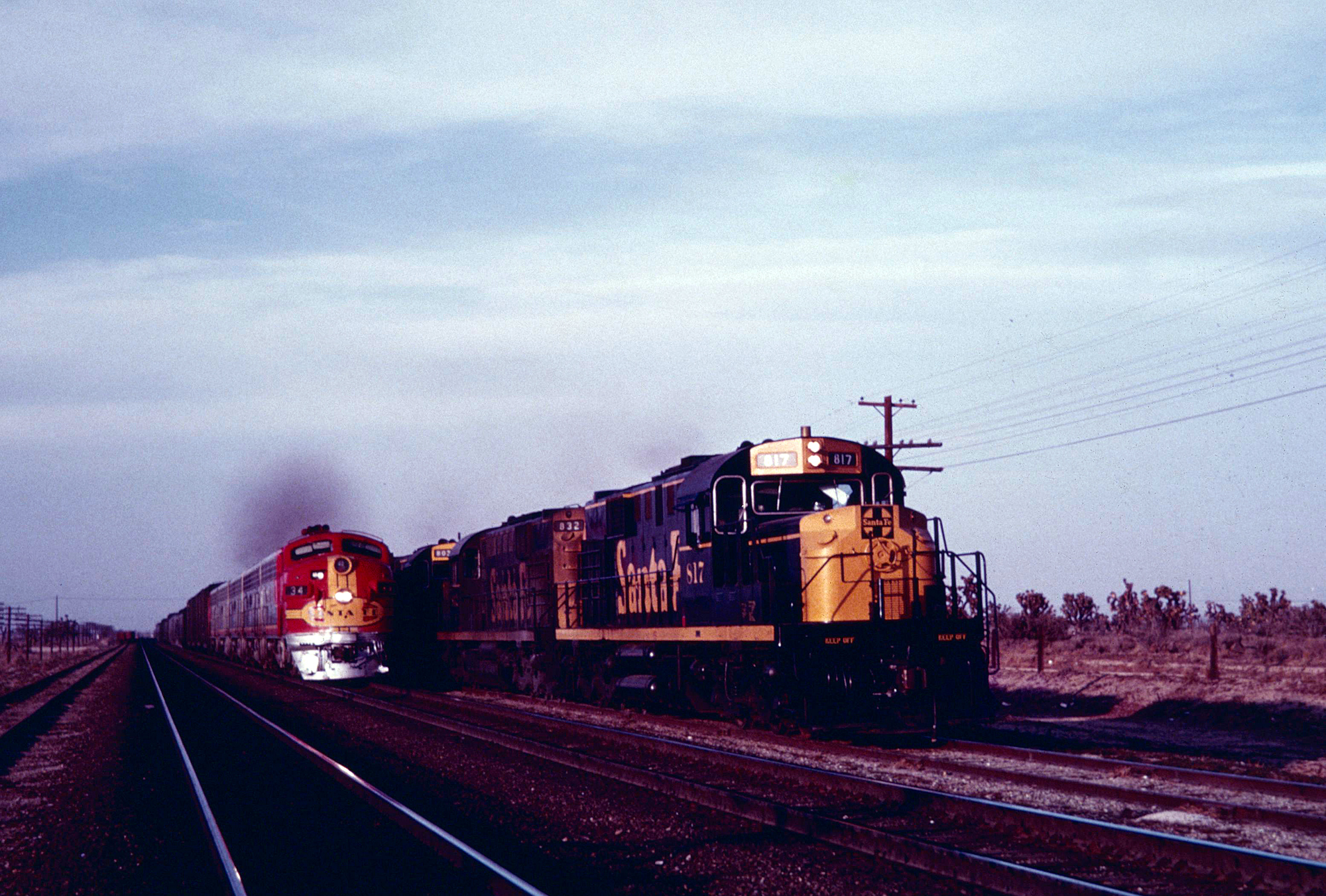Santa Fe power at the Argentine (Kansas) engine terminal, circa 1983. Mike Bledsoe photo. American-Rails.com collection.Backed by the Santa Fe, the CS built an additional 81 miles from San Bernardino to Barstow, meeting the AT&SF at that point. This last segment crossed 3,823-foot Cajon Pass, a winding but impressive engineering feat accomplished by California Southern's chief engineer, Joseph Osgood.