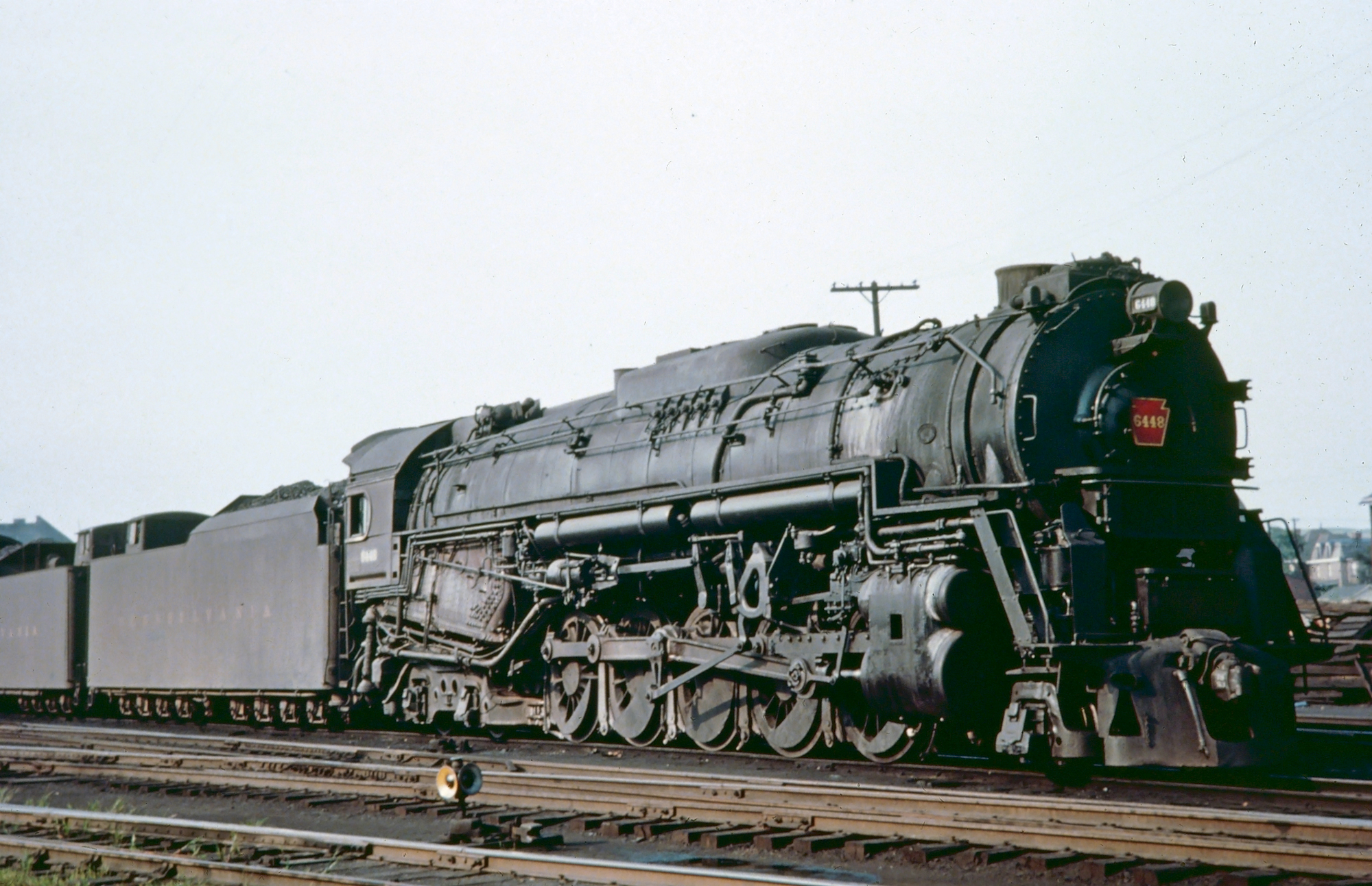 Pennsy 2-10-4 #6448 (J-1) leads a southbound through Worthington, Ohio (just north of Columbus) on June 10, 1956. Joseph Stark photo.When World War II kicked off, and the PRR needed a new locomotive to handle more substantial loads over the Alleghenies, they set their sights on the C&O 2-10-4 and Norfolk & Western’s “Super Power” articulated 2-6-6-4 from 1936, another successful design with 70-inch high drivers and immense power. During trials with both classes on the Horseshoe Curve, C&O 2-10-4 #3015 proved it had the “right stuff” for the PRR.