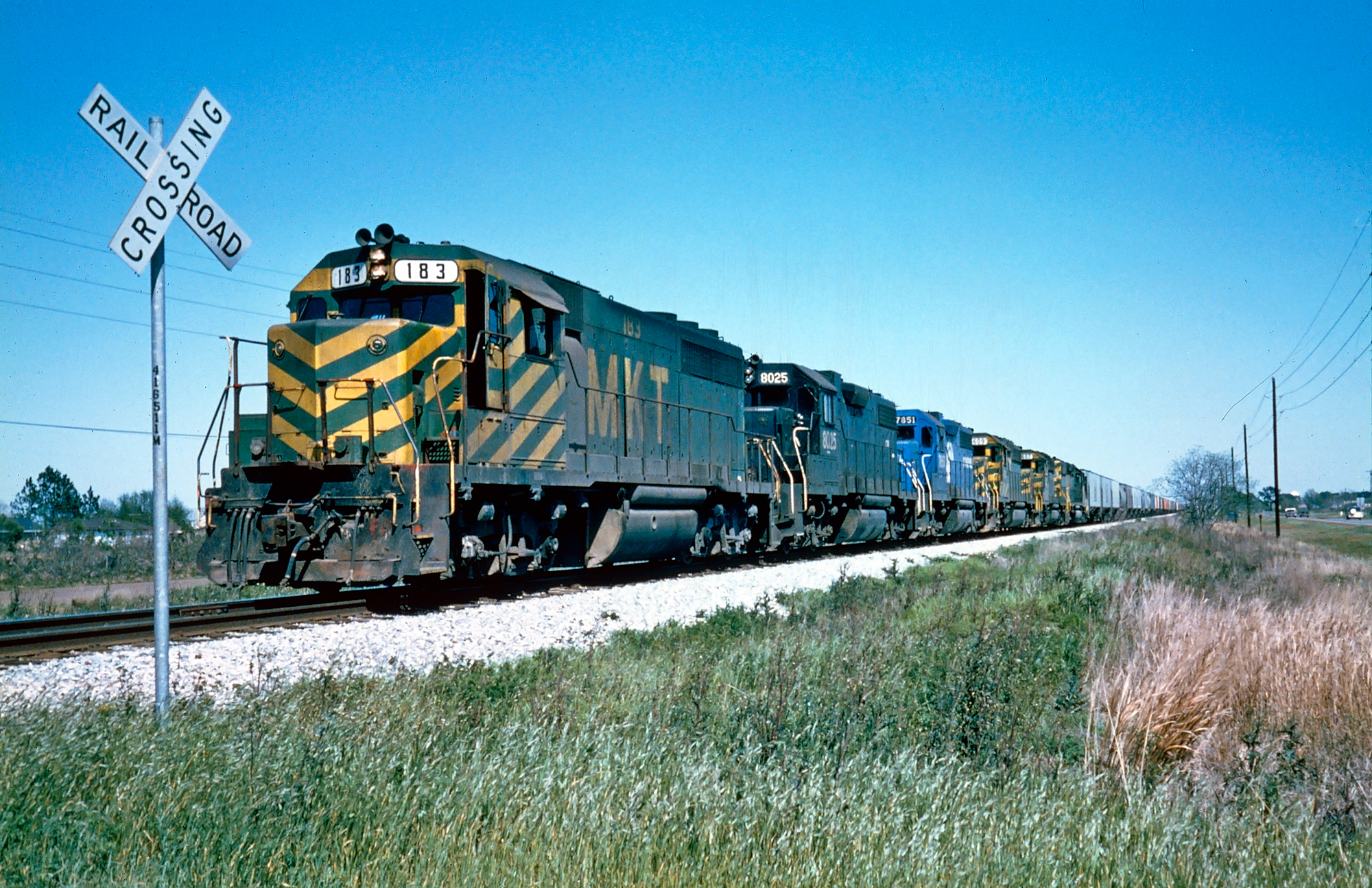 Katy GP40 #183, Conrail GP38-2 #8025 and GP38 #7851, and three other MKT units lead a general manifest between Taylor and Temple, Texas, circa 1983. Mike Bledsoe photo. American-Rails.com collection.The 645's most prominent difference was simply its size; the larger cylinder bore, 9 ½ inches, increased the individual cylinder displacement by a total of 78 cubic inches, from 567 to 645 cubic inches. The new engine could also be aspirated by either a Roots Blower or turocharger.