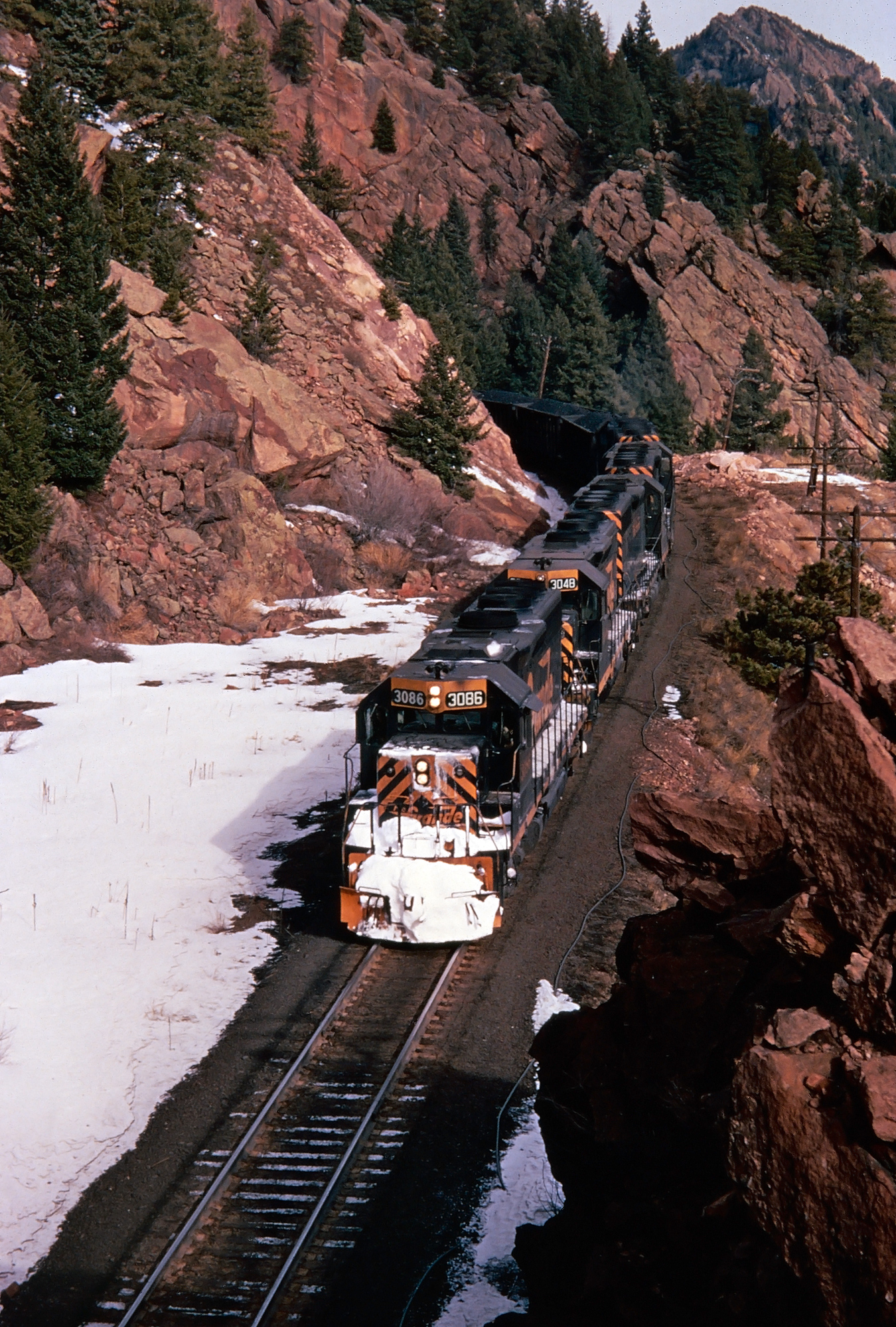 Rio Grande GP40 #3086, GP35 #3048, and three other units exit tunnel #8 near Plainview, Colorado with an eastbound coal drag as the train descends the Front Range into Denver, circa 1972. American-Rails.com collection.GP40-2