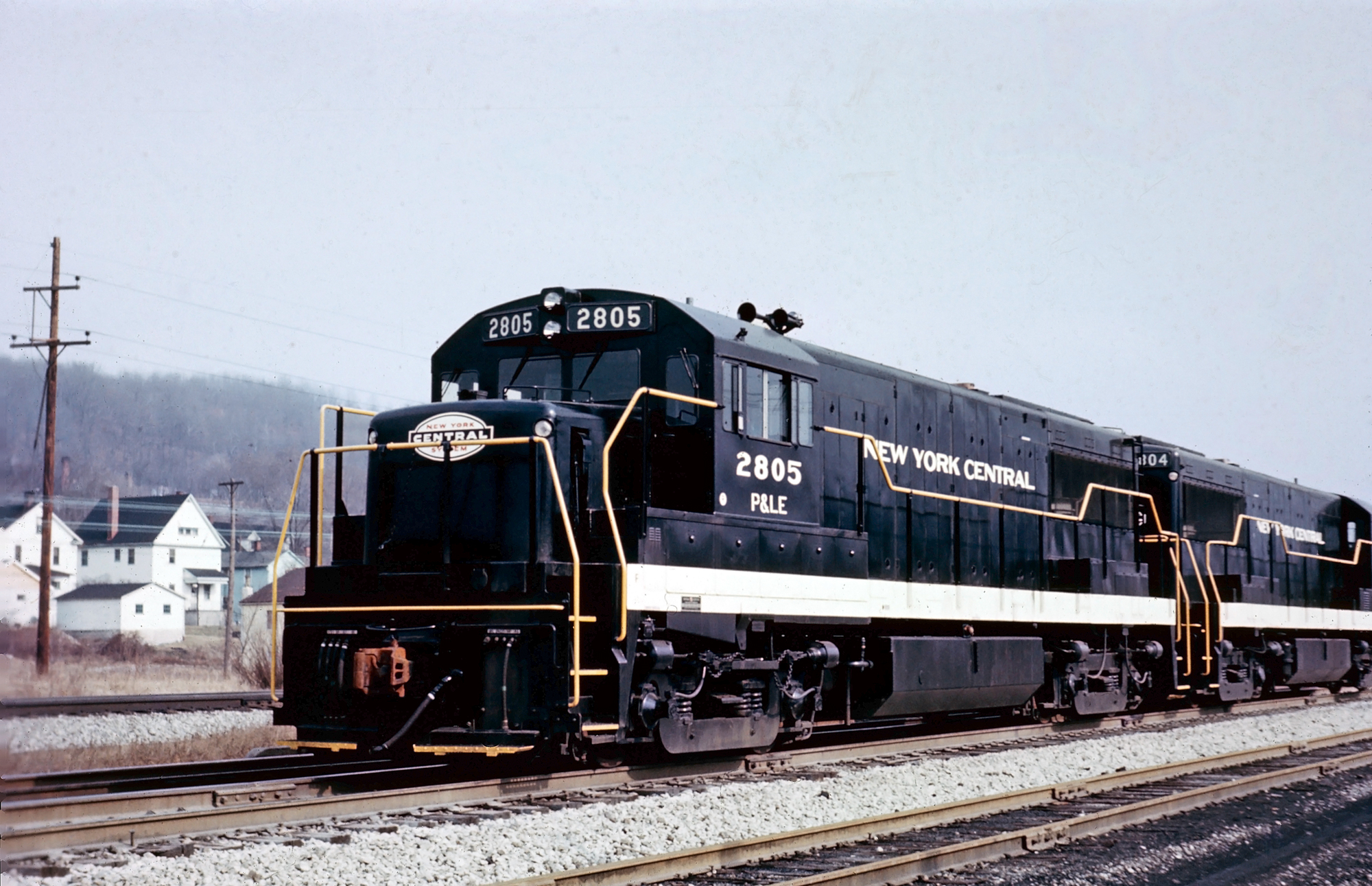 A set of new Pittsburgh & Lake Erie U28Bs, #2805 and #2804, were photographed here at Lowellville, Ohio in March, 1966. Photographer unknown. American-Rails.com collection.The U28B began production in January of 1966; the model was cataloged primarily to keep pace with similar designs in production by Electro-Motive and Alco.