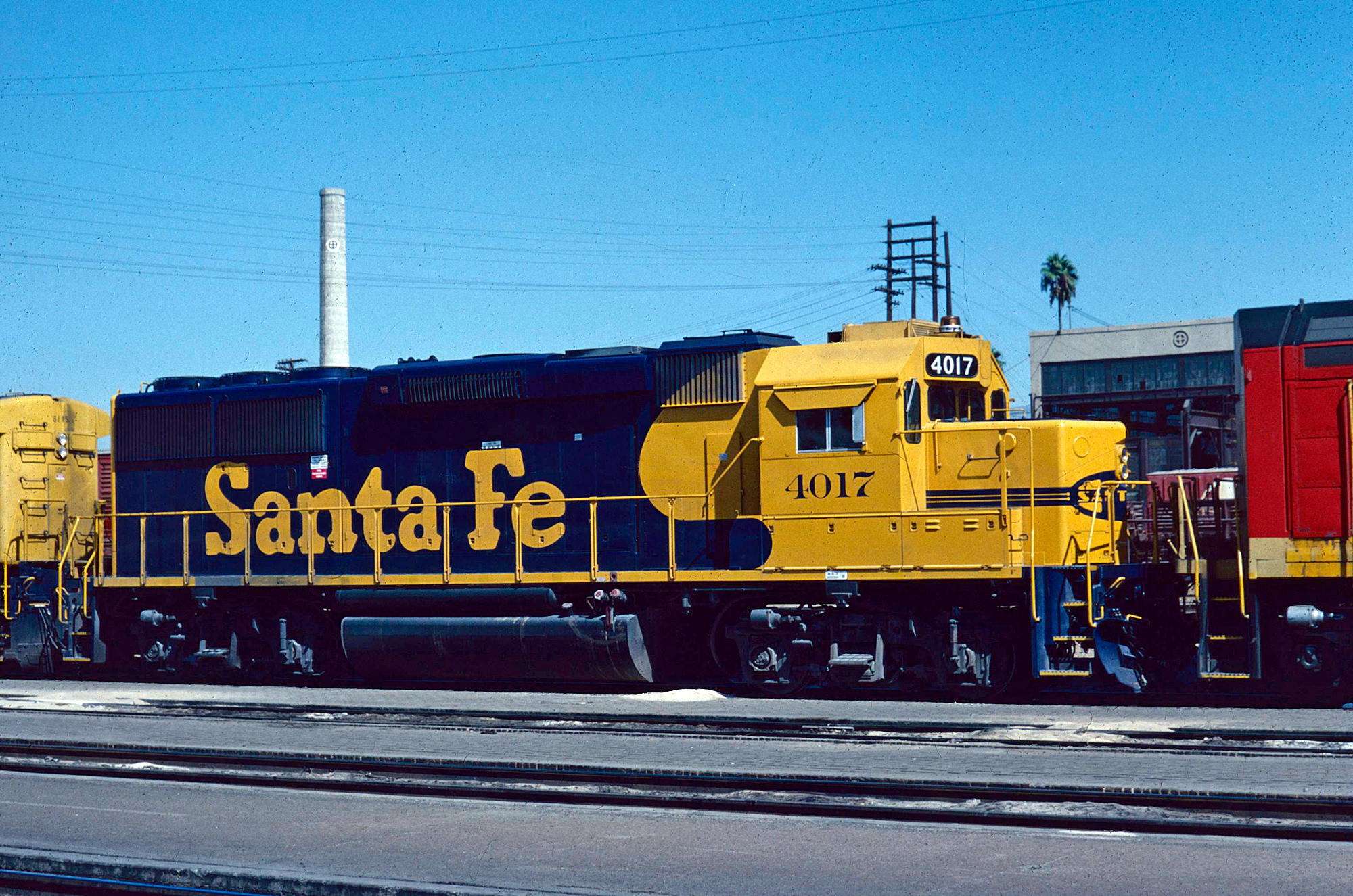 Santa Fe GP60 #4017 is seen here at San Bernardino, California on September 4, 1989. American-Rails.com collection.These units were rated at 3,000 horsepower and featured interesting touches to the carbody - greater beveling along the edges with a pointed nose - in an experimental effort to reduce aerodynamic drag. However, these cosmetic features were not incorporated into cataloged GP59s.