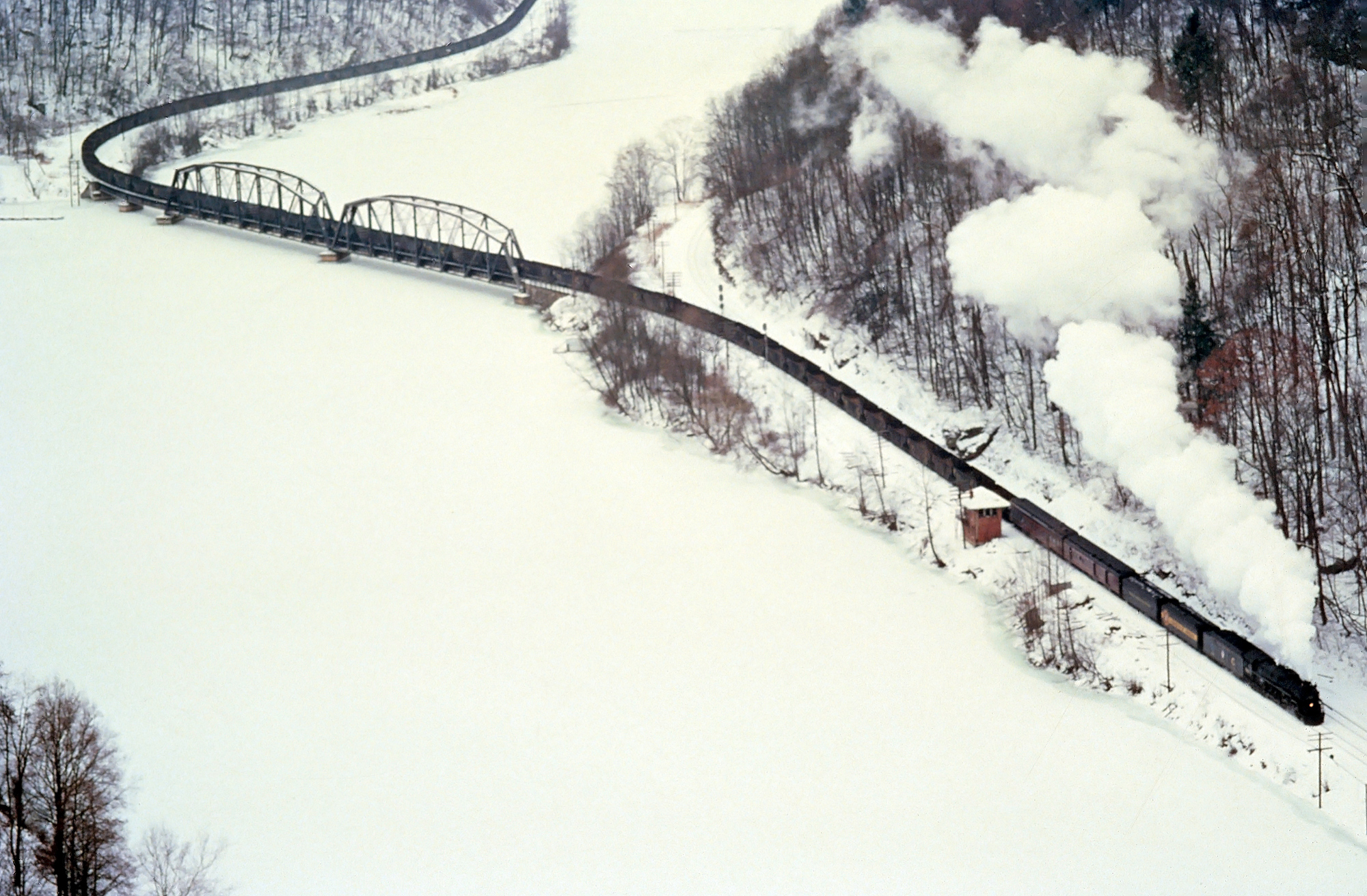 On January 2, 1985 armed with an army of gadgets and technical equipment to gather data concerning the efficiency of the Greenbrier in service it left the C&O main line at Huntington, West Virginia heading east towards Hinton. The bitterly cold temperatures during the trials and issues with the #614T made the tests somewhat inconclusive but the big 4-8-4 overall ran relatively well.