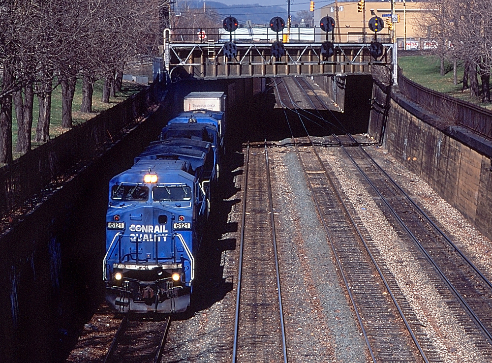 A trio of Conrail C40-8W's lead freight TV-2H through "The Trench" in Pittsburgh along the former Pennsylvania's main line on March 30, 1996. Wade Massie photo.One often forgotten aspect of the ballasting system is what is known as sub-ballast or sub-grade.