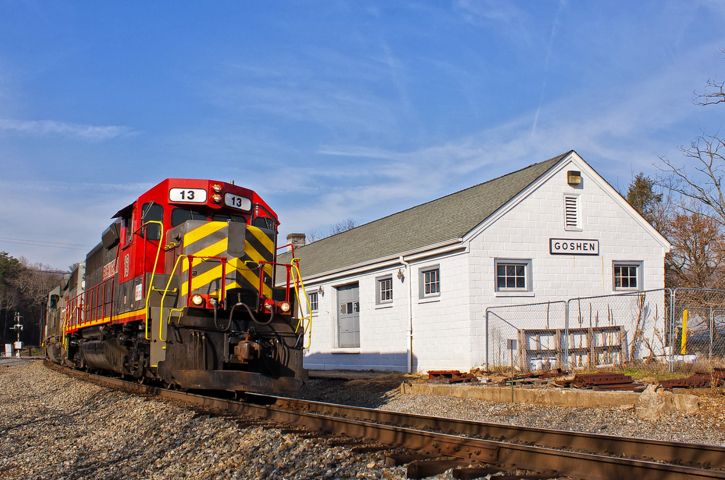 Buckingham Branch GP40-3 #13 has the 2011 "Toys For Tots" train sponsored by the Marine Corps Reserves at the former C&O depot in Goshen, Virginia. Loyd Lowry photo.The Buckingham Branch Railroad (BBRR) has roots that delve deep into the rich history of Virginia's rail system. It was founded in 1988 by Bob Bryant, who saw potential in revitalizing the C&O's former Dillwyn Branch.