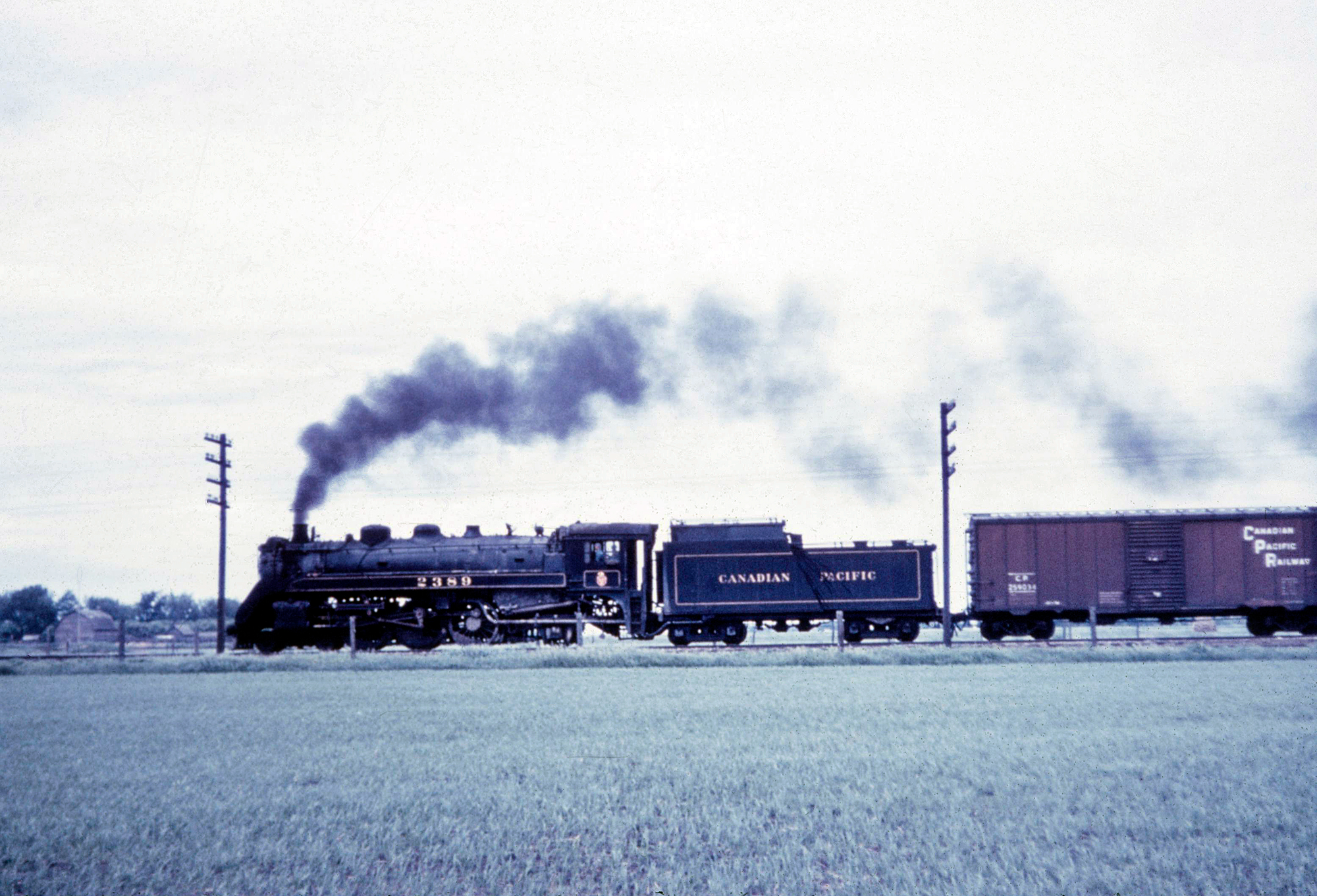Canadian Pacific 4-6-2 #2389, one of the G3 variants capable of dual service assignments, works freight service at Portage la Prairie, Manitoba during the 1950s. Paul Meyer photo. American-Rails.com collection.Following this work, nearby Rogers Pass was also improved as well as Crowsnest Pass to the south. The former included 5-mile Connaught Tunnel which passed through Mount Macdonald, thus lowering the summit by 540 feet (it also eliminated more than 2,300 degrees of curvature), and opened during December of 1916.