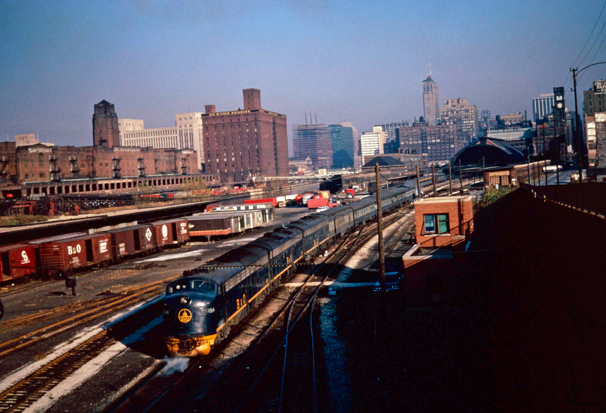 Baltimore & Ohio E9A #1454 (built as #34) leads train #5, the eastbound "Capitol Limited," out of Chicago's Grand Central Station on a fall morning in the late 1960s. American-Rails.com collection.The railroad even brought back its famed Deer Park spring water and all onboard vegetables were fresh, not frozen or canned. After Amtrak took over it initially canceled all B&O trains, including the Cap.