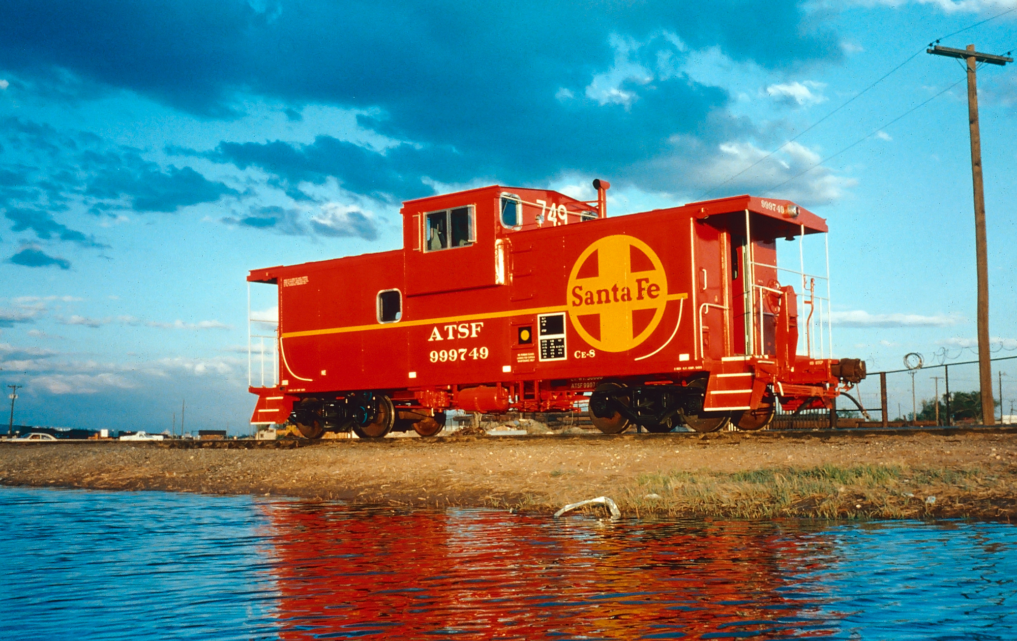 One of the Santa Fe's modern Class CE-8 cabooses, #999749, is seen here in Clovis, New Mexico in 1982. This class was manufactured by the International Car Company in 1978. Mike Bledsoe photo. American-Rails.com collection.The origins of the caboose appear to date back to the 1840s when Nat Williams, a conductor of the Auburn & Syracuse Railroad (a later affiliate of the New York Central).