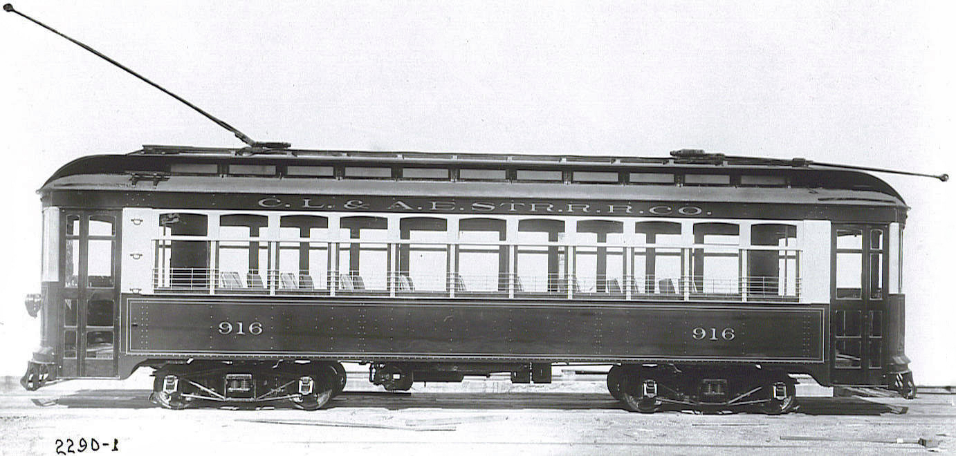 A Cincinnati Car Company photo of new Cincinnati, Lawrenceburg, & Aurora Electric Street Railway car #916 circa 1918. A total of seven of these cars were built for the company, #915-921.In any event, the Cincinnati Car primarily focused on building double-trucked cars as the early single-truck designs had largely been discontinued by the turn of the century due to less stability and a shaky safety record.