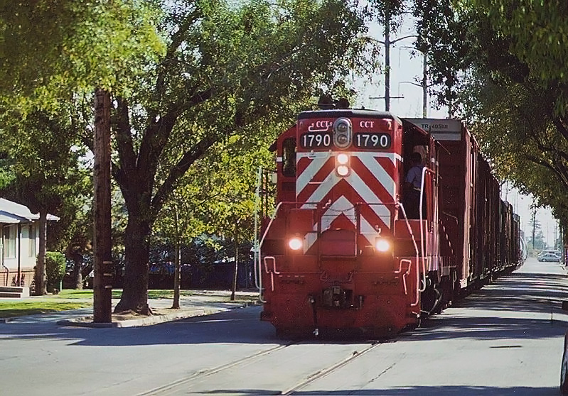 Central California Traction GP18 #1790 has just left Mormon Yard and rumbles north down the middle of tree-lined B Street in Stockton on October 21, 2005. The train has two more blocks of street running to go. After returning to the shops on Cherokee Road the train will then head north to Lodi. Doug Kroll photo.Established on August 7, 1905, the Central California Traction Company (CCT) was envisioned as an alternate streetcar line for Stockton's residents, standing in contrast to the Stockton Electric Railroad. Electrified passenger service began on September 1, 1907, ushering in direct competition with the Southern Pacific by connecting Stockton and Lodi.