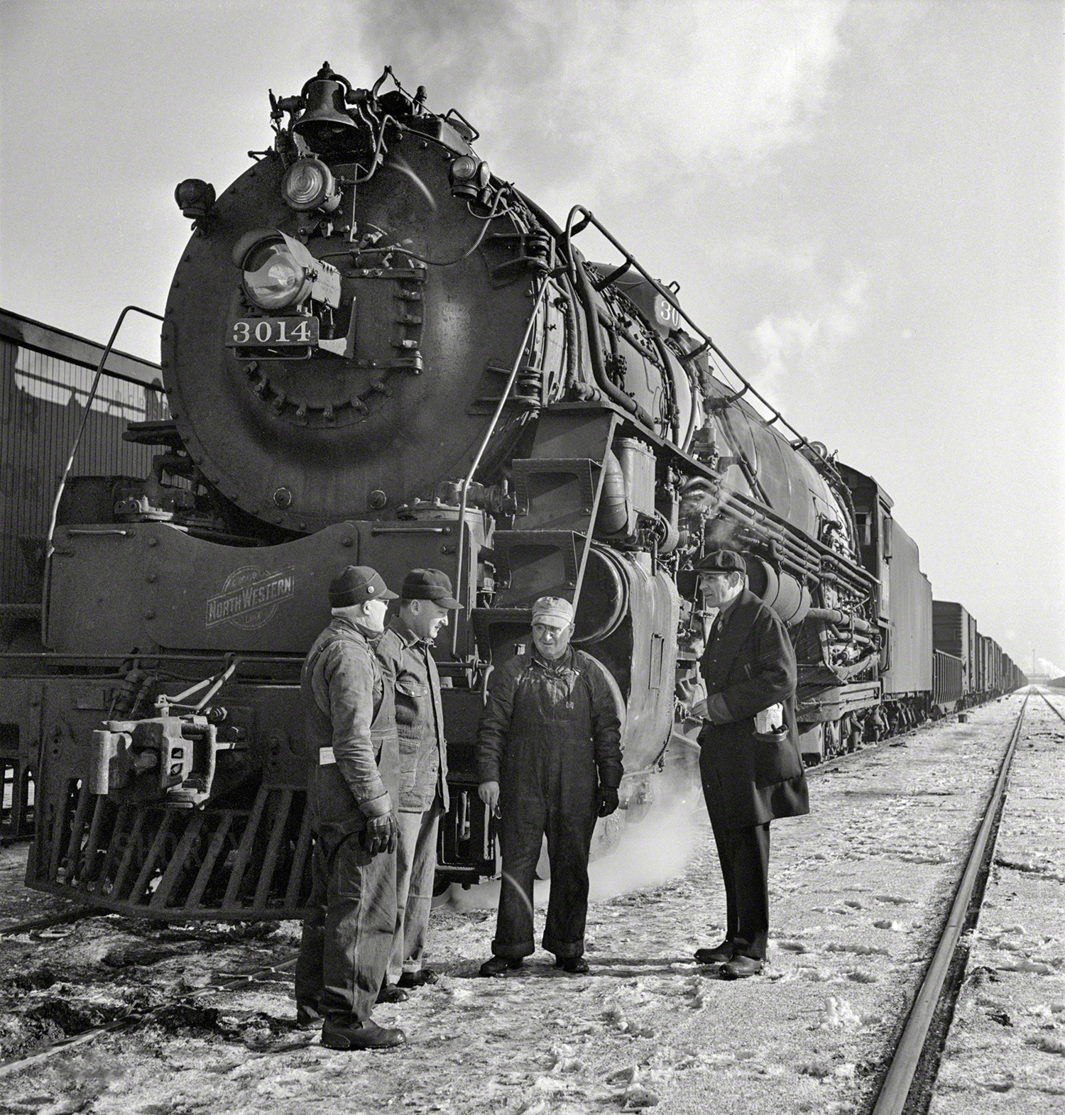 A Chicago & North Western crew, standing beside Class H 4-8-4 #3014, chat while waiting for orders to pull out during a cold January day in 1943. The big Northern was a 1929 product of Baldwin. Jack Delano photo.In addition, the Burlington and Milwaukee Road were gearing up for their own streamliners in the hotly contested Chicago-Twin Cities market. Following the CB&Q's debut of its Zephyr trainset the railroad introduced regular service to this corridor in April of 1935. It was followed a month later by the Milwaukee's legendary Hiawatha. The North Western, in effort to keep up, began upgrading its main line for high-speed operation. As Mike Schafer notes in his book, "Classic American Railroads," since the C&NW's Chicago-Twin Cities route was roughly 400 miles and the service scheduled for around 400 minutes the new train was given the name '400.' The only catch, it was originally not streamlined; due in part to its ongoing financial situation the railroad had to utilize a quartet of overhauled (non-shrouded) 4-6-2's (E-2a). To increase their speed the Pacific's were rebuilt as oil burners, given larger driving wheels, and carried bigger tenders among their more notable improvements. In addition, heavyweight cars were upgraded with better suspension and other perks. The '400' officially launched on January 2, 1935 and proved successful enough that new streamlined equipment and sleek Electro-Motive E3's arrived in 1939. Eventually, a fleet of '400's' was unveiled across the Midwest. Surprisingly, they were actually not C&NW's official introduction into the streamliner age. Following their agreement, UP wasted no time in launching its transcontinental services, acquiring its first trainsets from Electro-Motive/Pullman in June of 1935. As trains like the first-class City of Los Angeles, City of Portland, and City of San Francisco grew in popularity conventional lightweight equipment (non-articulated) arrived for these services through the 1940's.