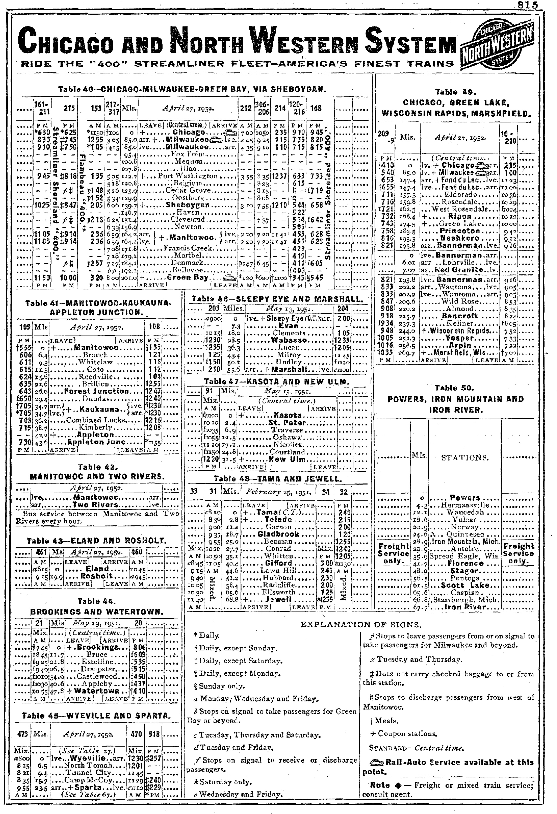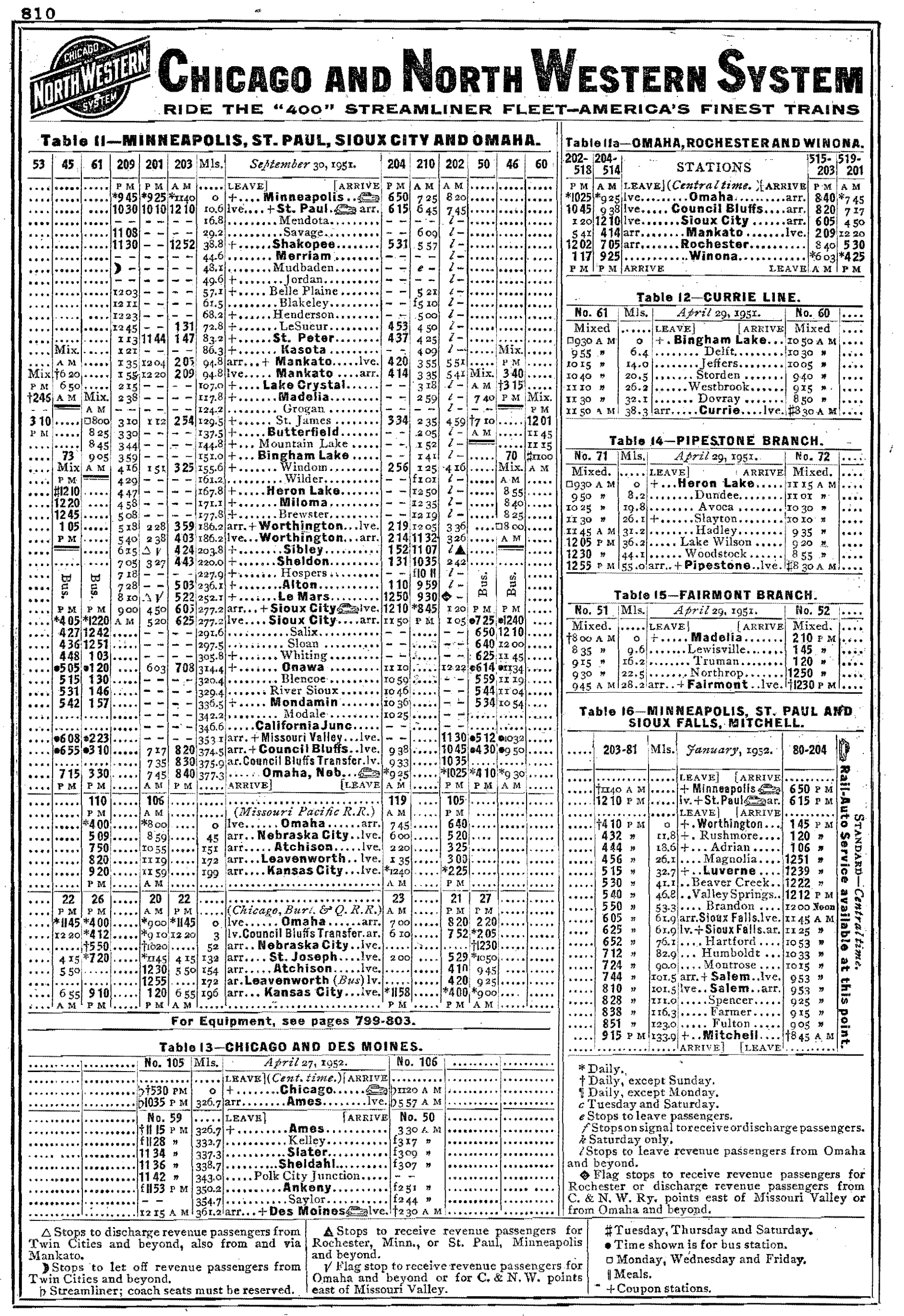 Chicago - Fremont - Omaha, Nebraska Fremont, Nebraska - Lander, Wyoming Nelson, Illinois - St. Louis Chicago - Madison, Wisconsin - Minneapolis Milwaukee - Mankato, Minnesota - Rapid City, South Dakota Eau Claire, Wisconsin - Duluth, Minnesota Chicago - Kenosha - Milwaukee Chicago - Bain, Wisconsin - Milwaukee Milwaukee - Manitowoc, Wisconsin - Green Bay Milwaukee - Fond du Lac, Wisconsin - Green Bay Green Bay - Ashland Green Bay - Ishpeming, Michigan Powers, Michigan - Hurley, Wisconsin Twin Cities - Mankato - Omaha Lake Crystal, Minnesota - Des Moines, Iowa | |