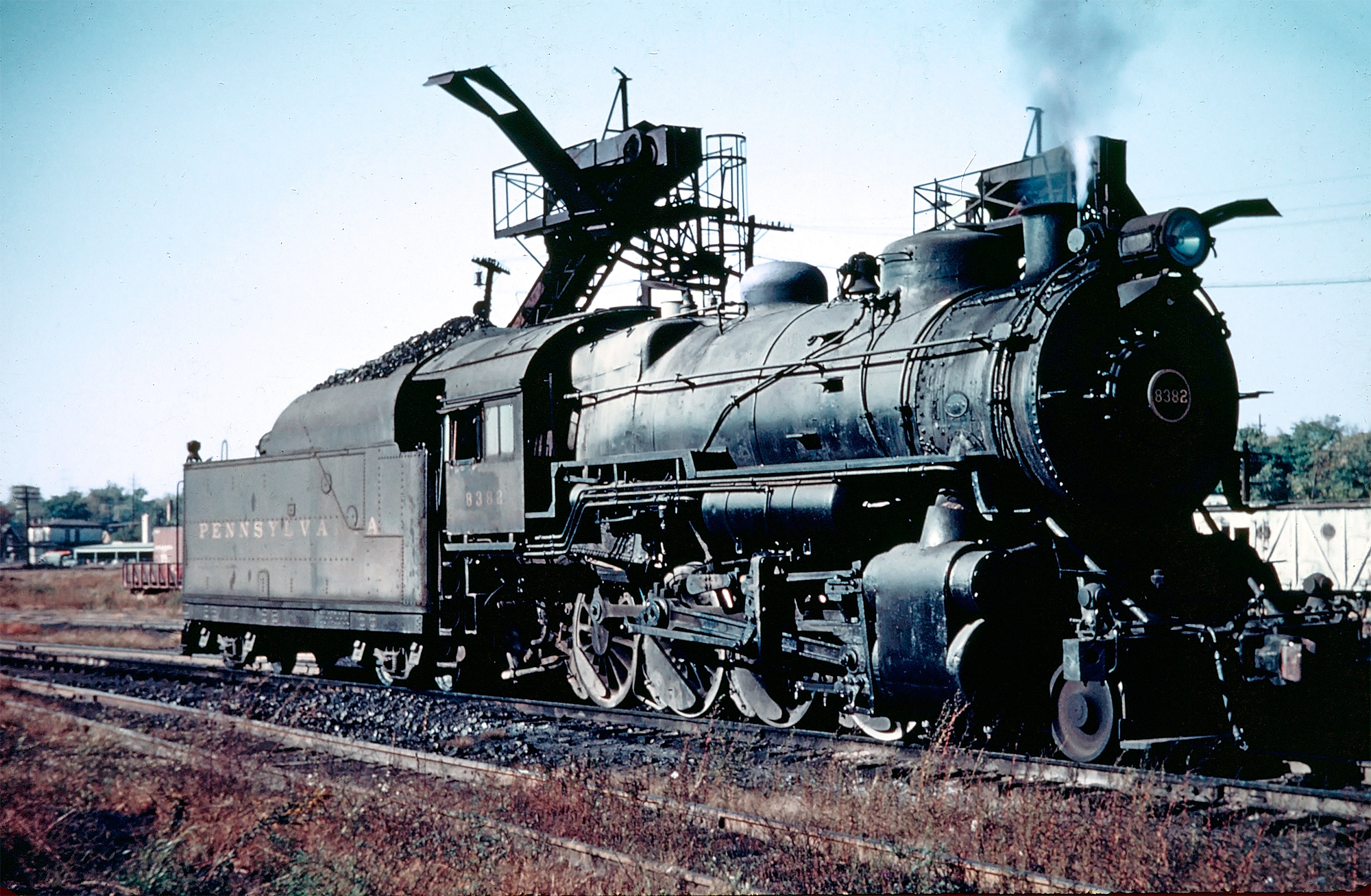 Pennsylvania Railroad 2-8-0 #8382 (H-10s) simmers away at Hawthorne Yard in Indianapolis, Indiana, circa 1953. The Consolidations were workhorses on the PRR in light/medium freight assignments, as on most railroads. The Pennsy once rostered some 3,335 examples of this wheel arrangement during the 1920s. This particular unit was manufactured by Alco's Brooks Works in August, 1916 and retired in November, 1957. Fred Byerly photo. American-Rails.com collection.The Consolidation proved exceptionally capable of handling increased weight, a trait that allowed it to remain a cornerstone of railway operations well into the 1920s. Throughout its years of service, the design was continuously refined until the physical limitations of its size ultimately curtailed further advancements.