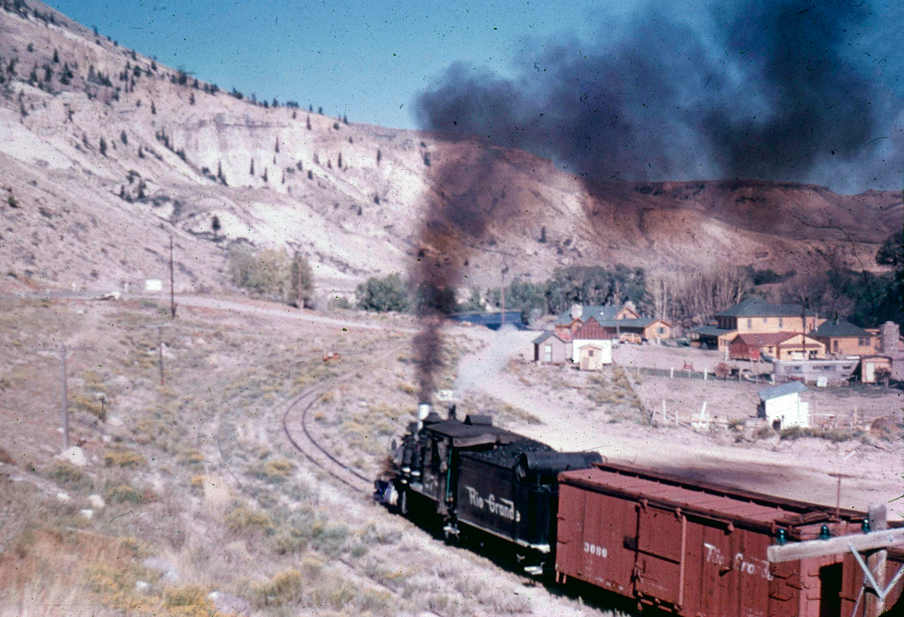Denver & Rio Grande Western 2-8-0 #278 heads east over the narrow-gauge Gunnison Branch as the train nears Cebolla, Colorado during the 1950's. The right-of-way here now lies beneath the Blue Mesa Reservoir. James Stitzel photo. Author's collection.While the Consolidation locomotive was eventually surpassed by larger and more technologically advanced designs such as the 2-8-2s, 2-10-0s, 4-8-2s, and others, many railroads found continued utility in the Consolidation until the close of the steam era.