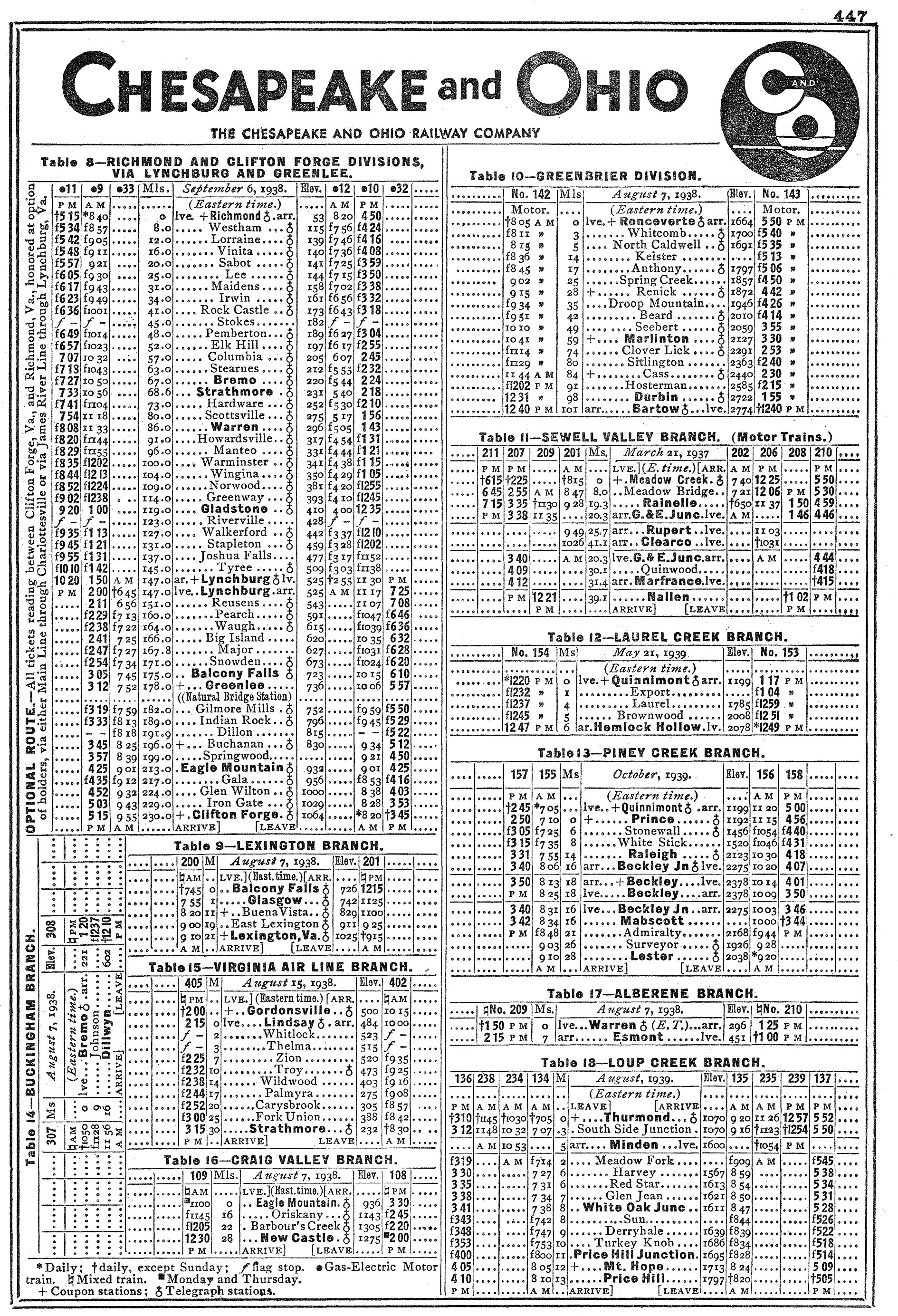 Chicago - Cincinnati, Ohio - Ashland, Kentucky - Staunton, Virginia - Newport News, Virginia Gordonsville, Virginia - Washington, D.C.Clifton Forge - Richmond, VirginiaAshland - Louisville, KentuckyAshland, Kentucky - Columbus, Ohio - Toledo, OhioColumbus - Pomeroy, OhioCatlettsburg, Kentucky - Elkhorn City, KentuckyRonceverte - Durbin/Bartow, West Virginia (Greenbrier Branch)Chicago - Grand Rapids, Michigan - Detroit - St. Thomas, Ontario - Buffalo/Niagara Falls, New York (ex-Pere Marquette)Grand Rapids - Petoskey/Bay View, MichiganErieau, Ontario - Ludington, MichiganLudington - Milwaukee/Manitowoc/Kewaunee, Wisconsin (car ferry service)Toledo - Bay City, MichiganPort Huron - Bay City - Elmdale, MichiganHolland - Muskegon - Hart, Michigan | |