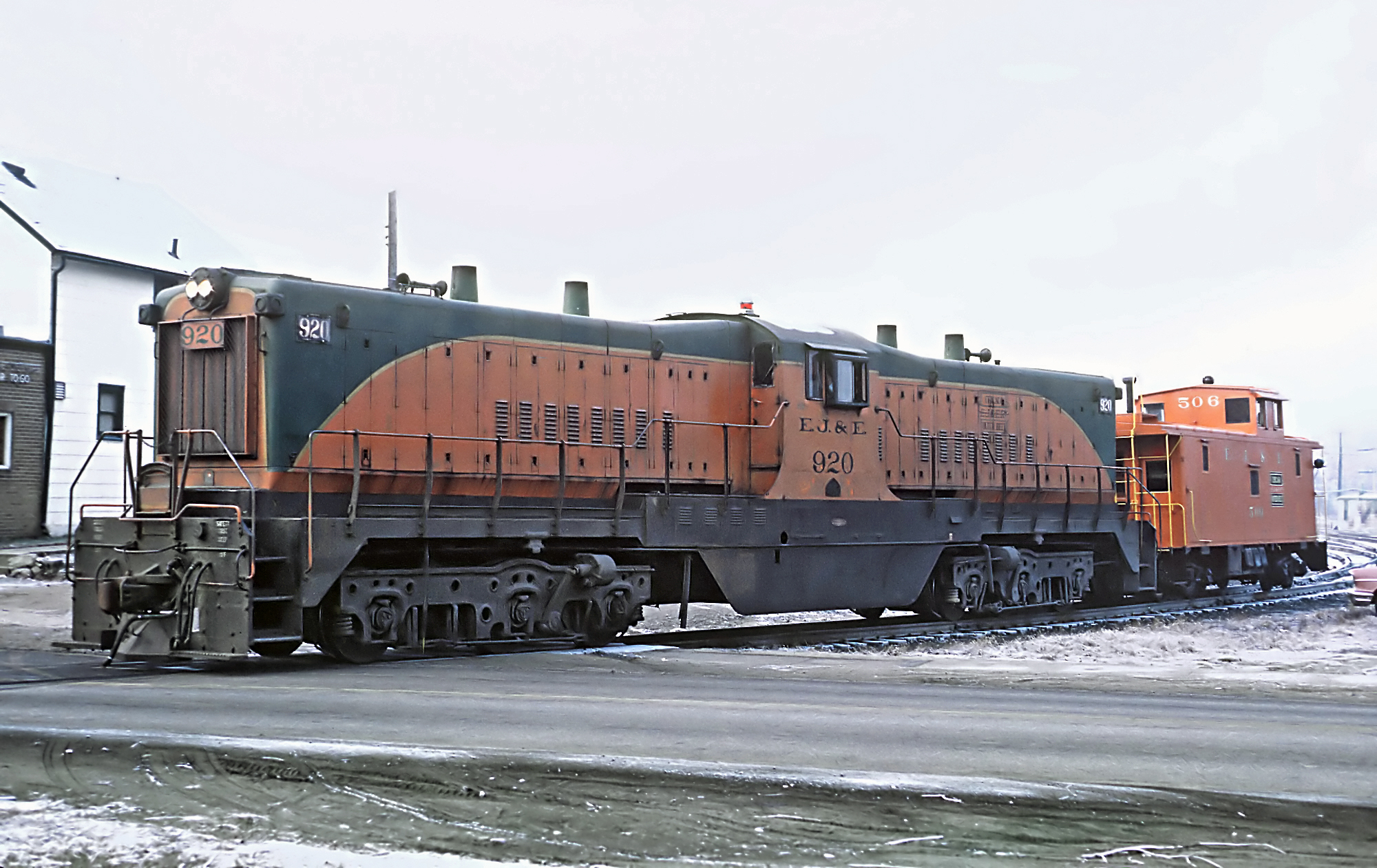 Elgin, Joliet & Eastern DT-6-6-2000 #920 is seen here on a caboose hop at Griffith, Indiana in January, 1965. Roger Puta photo.The Elgin, Joliet & Eastern Railway was sort of a hybrid; it was not exactly a belt line although its main line did, indeed, encircle Chicago. It contained characteristics of a line-haul system with a 175-mile corridor connecting the eastern trunk lines in northeastern Indiana with their Midwestern counterparts in Illinois.