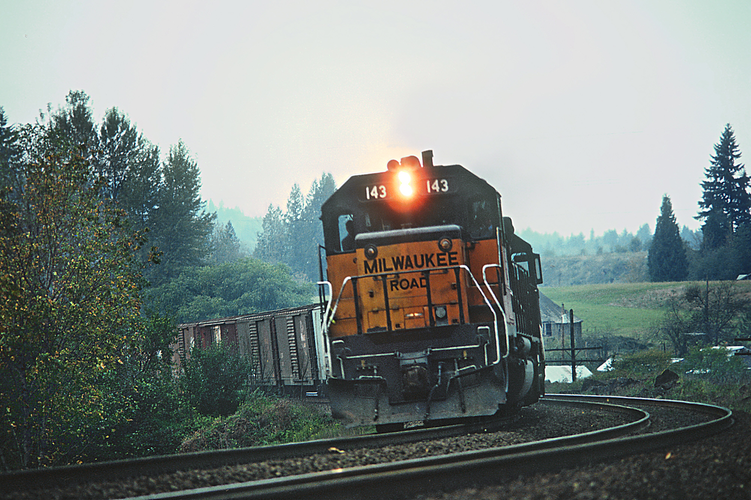 The Milwaukee Road's final years in the west...SD40-2 #143 leads a consist southbound over the Burlington Northern north of Castle Rock, Washington on an October day in 1978. Roger Puta photo.The company wasted no time finishing this project; the Rocky Mountain Division was ready for service in early 1917 while the Coast Division was finished in November, 1919 (wires were later strung over the 9 miles from Black River Junction/Renton into Seattle Union Station during July of 1927). As the Woods' book notes the railroad had planned to finish the gap between Avery and Othello. However, due to the traffic split at Plummer Junction (Passenger consists serving Spokane did so over a line that opened in 1914, which partially utilized Union Pacific trackage rights to reach that city while freight trains, ran the original route through Tekoa, Malden, and Marengo.), the section's easier grades, and a downturn in the economy shelved this proposal. The decision to electrify cost the Milwaukee an additional $23 million ($15 million for the Rocky Mountain Division and $9 million on the Coast Division) resulting in an unsatisfactory financial situation as debt ballooned to $490 million. If officials had known the poor economy their railroad would be facing afterwards, coupled with the government's nationalization scheme, they may have opted against going west entirely.