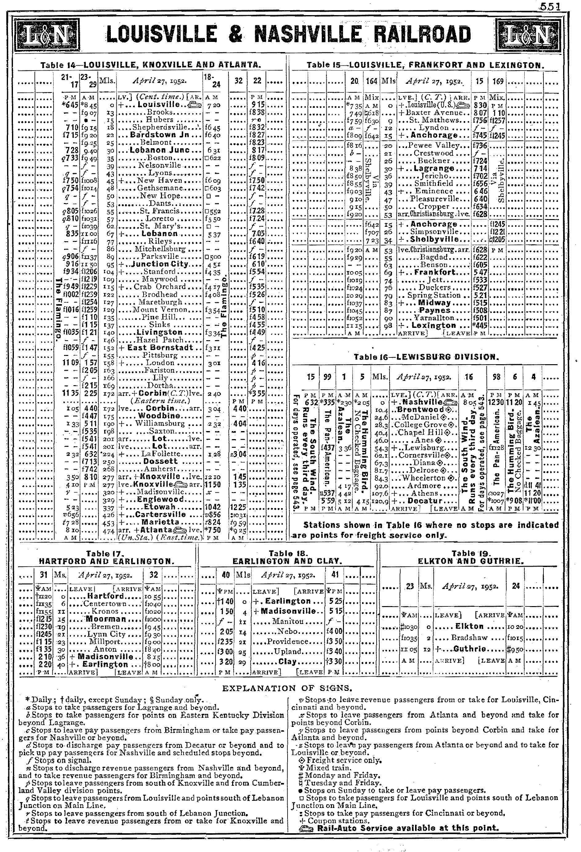 Cincinnati - Louisville - Nashville - Birmingham - Montgomery - Mobile - New Orleans Nashville - Evansville, Indiana - St. Louis Louisville - Evansville Bowling Green - Memphis Cincinnati - Knoxville - Atlanta Flomaton, Alabama - Chattahoochee, Florida Anchorage - Lexington - Hazard, Kentucky Corbin - Baxter, Kentucky Lebanon Junction - Sinks, Kentucky Winchester - Fleming, Kentucky Nashville - Chattanooga - Atlanta | |