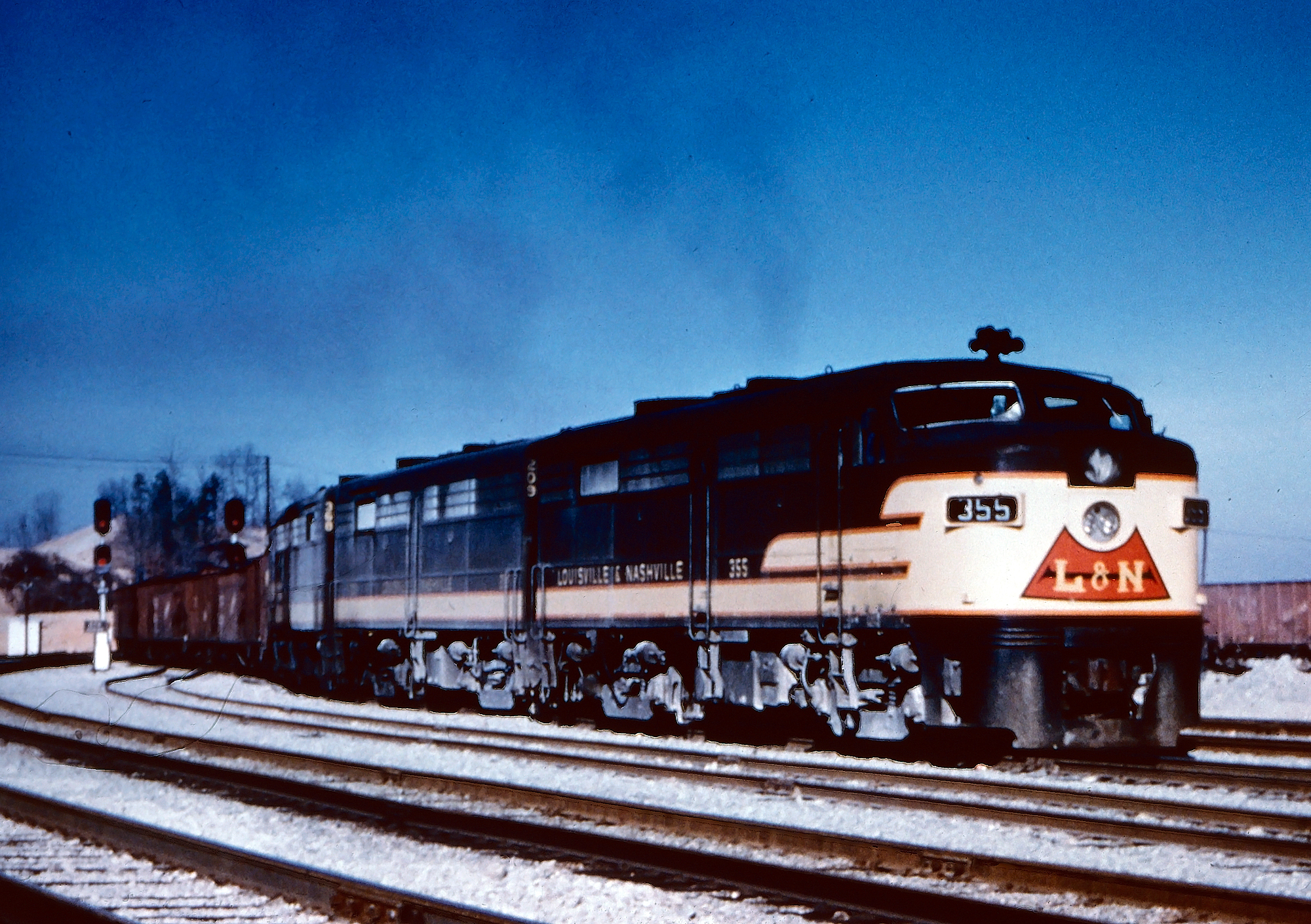 Louisville & Nashvile FA-2 #355 - along with an F7B, GP7, and F7A - lead a freight train through Anchorage, Kentucky on September 26, 1964. Photographer unknown. American-Rails.com collection.In addition, early first generation diesels wore a separate livery. It remained this way until August 30, 1957 when the NC&StL was formerly merged into the Louisville & Nashville.