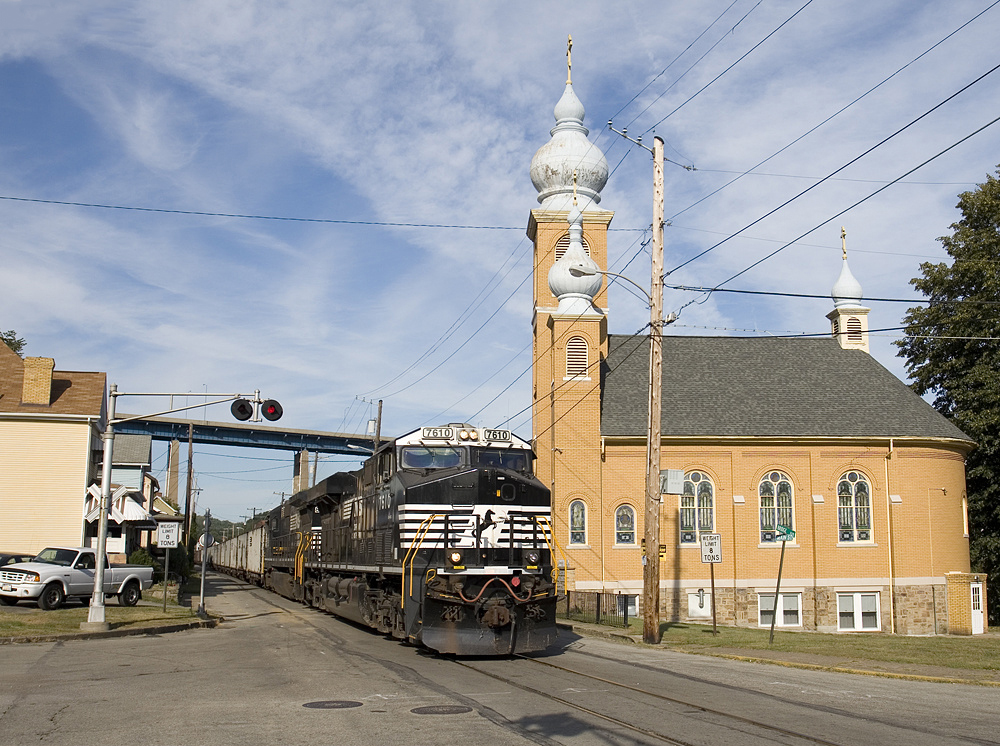 Norfolk Southern ES40DC #7610 leads an empty string of coal hoppers down Main Street in West Brownsville, Pennsylvania on August 25, 2008. Wade Massie photo.Southern Railway: The other primary NS component was the Southern Railway, a system originally formed on July 1, 1894 by the consolidation of the Richmond & Danville and East Tennessee, Virginia & Georgia railroads.