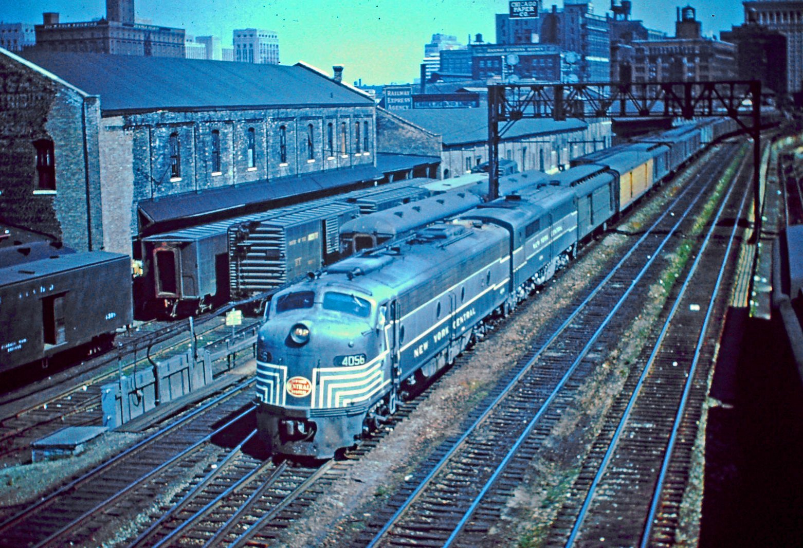 An interesting locomotive combination (E8A #4056, manufactured by Electro-Motive, and a PB-1, built by American Locomotive of Schenectady, New York) leads this New York Central mail/express train out of Chicago's LaSalle Street Station on June 29, 1958.The Pacemaker was listed as the top trains on New York Central's timetable, #1 westbound, and #2, eastbound, when introduced. At first it did not sport all-lightweight cars like the Trail Blazer but was nevertheless a fine service.