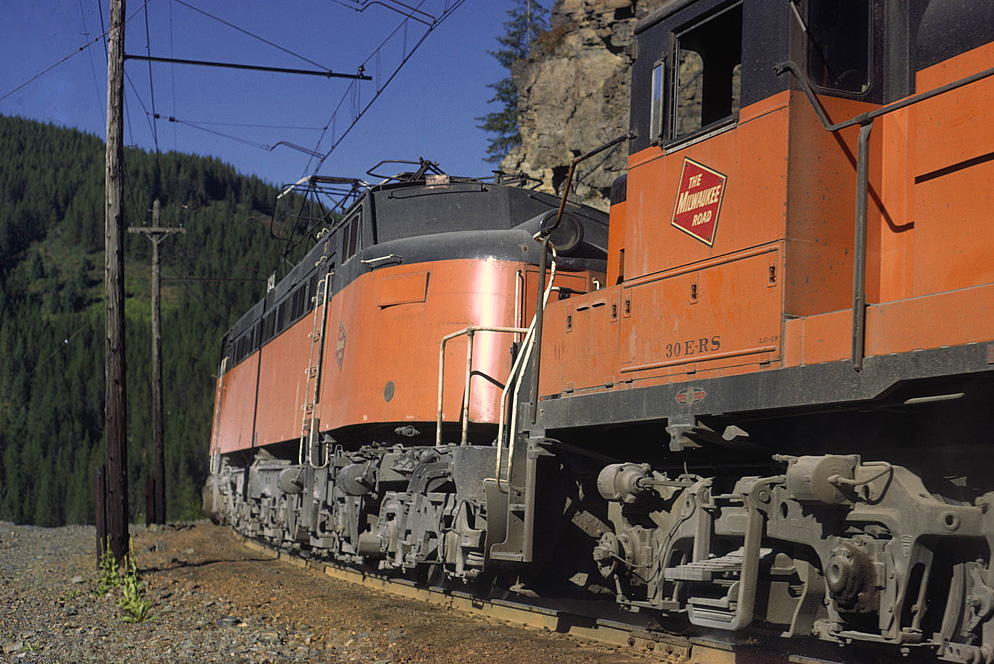 Milwaukee Road Little Joe #E21 and three GP40s grind eastbound out of Avery, Idaho along the St. Joe River with their freight during August of 1971. Drew Jacksich photo.The demise of the Milwaukee Road had already begun, however. Top management at the time had all but given up on wanting to run a railroad. In 1972 it decided to discontinue (but not scrap) electrified operations on the Coast Division between Othello and Seattle. Then, in 1974 the railroad canceled its electrification completely running its final Little Joes in June of 1974 between Harlowton, Montana and Avery, Idaho. Maintenance of the route was all but halted through the 1970s and 10 mph slow orders were rampant during the line's final years. By 1977 the very poorly managed Milwaukee Road entered bankruptcy and in an stunning move in 1979 decided to scrap its entire Extension west of Terry, Montana, some 1,100 miles of track. Ironically, the best engineered line through the northern Rockies is the only such route to ever be formally abandoned. Today, much of the original right-of-way through Montana, Idaho, and Washington remains in place although it is now owned by locals save for small stretches in Idaho and virtually all of the line through Washington (which is owned by the state).