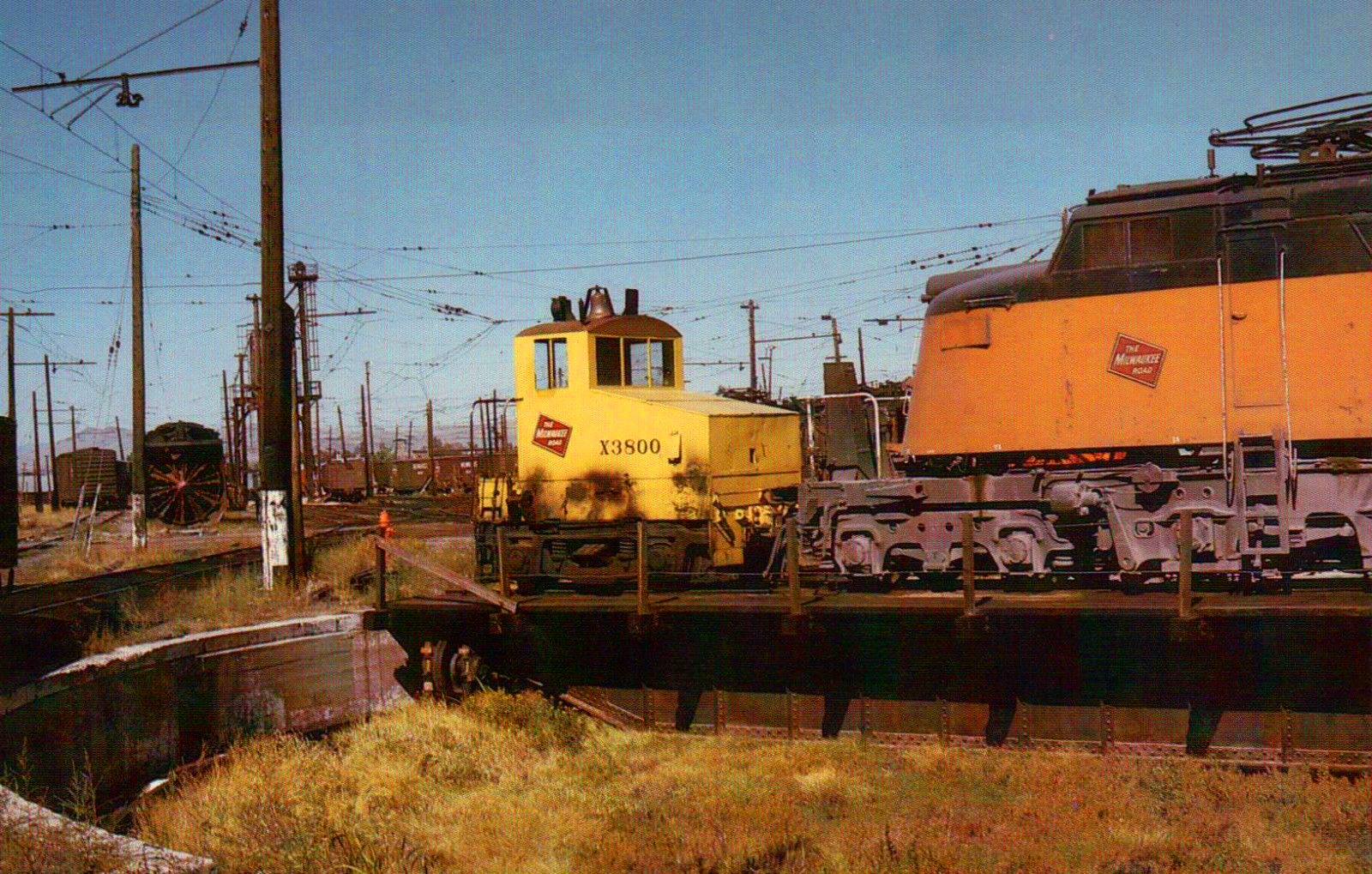 One of the Milwaukee Road's little shop switchers, X3800, pulls a "Little Joe" out of the roundhouse and onto the turntable at Deer Lodge, Montana in September of 1973.The Bi-Polars enjoyed relatively long lives and were scrapped in 1962 while the original EP-1s and EF-1s were retired following the purchase of the EF-4s in 1950 (however, boxcab classes EF-2, EF-3, and EF-5 remained in service along with the Little Joes until the end). While the Extension became an efficient and reliable main line, even after the CMStP&P's reorganization in the mid-1920s the route still failed to live up to expectations, particularly with the oncoming of the Great Depression in 1929. Even the surge of traffic during World War II was not enough for the railroad to stave off a second bankruptcy in 1945. Interestingly, the best years of Lines West lay ahead. In 1947 the Milwaukee Road canceled the premier Olympian and inaugurated the posh Olympian Hiawatha between Chicago and Seattle.