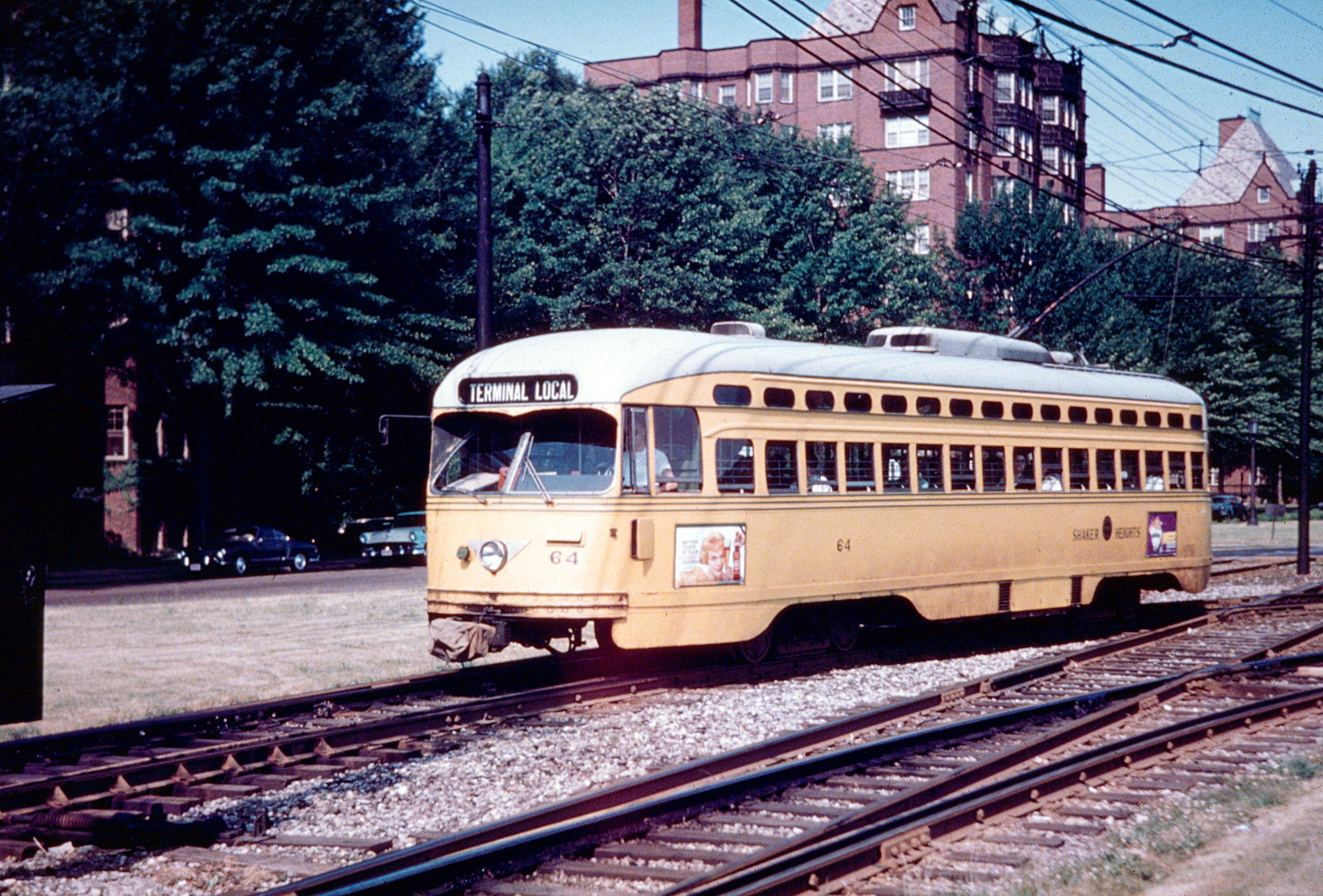 Shaker Heights Rapid Transit PCC #64 is along Shaker Boulevard and Van Aken Boulevard heading west at Shaker Square, Ohio (Cleveland) during the 1960s. American-Rails.com collection.The modern streetcar, from which the later interurban movement blossomed, is credited to Frank Sprague, a U.S. naval officer who had graduated from the United States Naval Academy in 1878.