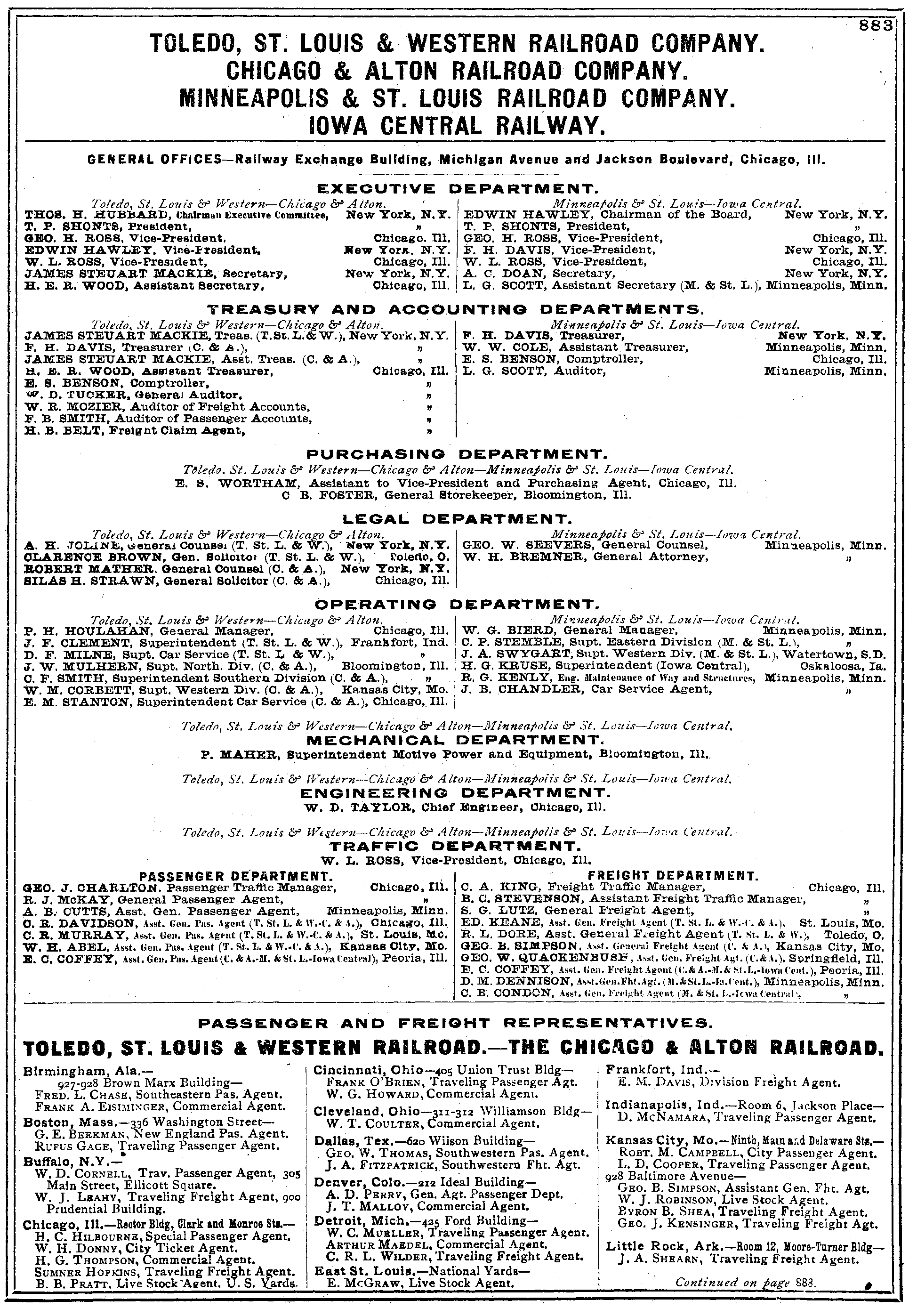 The remaining Toledo - East St. Louis line was reincorporated as the Toledo, St. Louis & Kansas City Railroad on June 12,1886. In 1887 the first segment from Toledo to Frankfort, Indiana was standard-gauged followed by the Frankfort-St. Louis segment in 1889.