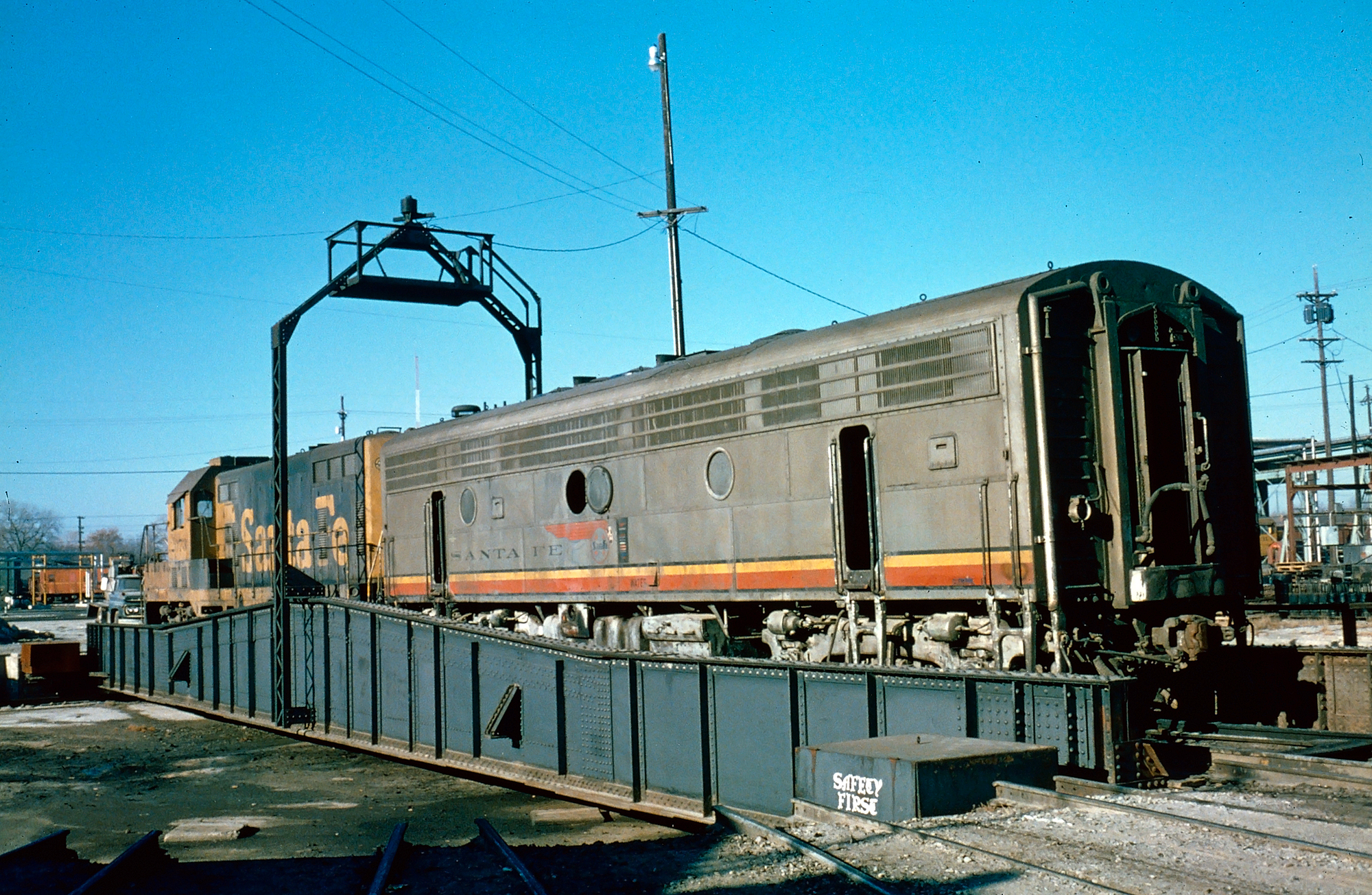 Santa Fe GP7u #2073 (built as GP7 #2808) and an F7B go for a spin on the turntable at the AT&SF shops in Cleburne, Texas, circa 1980. The B unit is likely soon to be rebuilt into a CF7. Mike Bledsoe photo. American-Rails.com collection.In nearly all terminals in which railroads constructed a turntable the structure was located next to or near a roundhouse, a semicircular building that was used to store steam locomotives and perform light maintenance on railroad equipment.