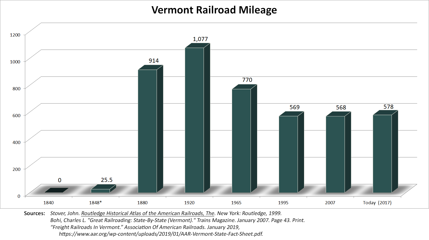 For more information on Vermont railroads in terms of route mileage over the years please refer to the chart above.