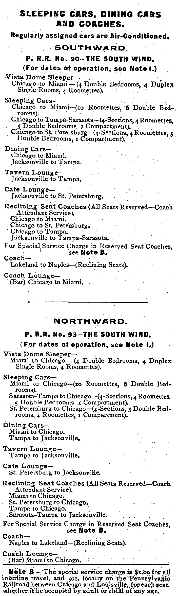 A nice A-B-A set of Florida East Coast E7's have the "South Wind" (Chicago - Miami, via the Pennsylvania/Louisville & Nashville/Atlantic Coast Line/Florida East Coast) approaching Jacksonville, Florida in 1958. Howard Robins photo.After the Penn Central merger of 1968, service on its leg of the route suffered tremendously, particularly as its financial condition worsened. By December, 1969 the PC provided only a coach connection to Louisville which forced the L&N and then Seaboard Coast Line to provide remaining services south of that point to Florida.